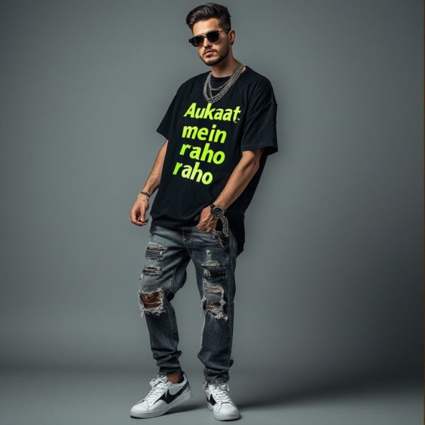 Shop the latest Aukaat Mein Raho Oversized Printed T-Shirt for men. Premium cotton, trendy streetwear design, perfect for casual style. Order online in Pakistan with fast delivery″